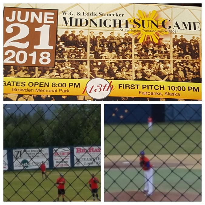 One year ago my step-son, M____, and I stood in the seats behind home plate at Growden Memorial Park, in Fairbanks, Alaska. It was just after ten P.M. and the park was lit in shifting series of hues, ranging from a fading gold to a subdued gray as the threat of rain remained as much an unfulfilled promise as the nearing but never quite there sunset. We were listening to a local group’s rendition of the “Star Spangled Banner”, awaiting the beginning of the annual game played in celebration of the summer solstice. On that evening the home team Alaska Goldpanners were playing the Orange County Surf. The Goldpanners began hosting the contest in 1960 but an unlighted ballgame has been played on June 21 in Fairbanks every year since 1906. I first read about it in, if memory serves, an article in Sport magazine, when I was just about the age that M___ was (eighteen) as we got ready for the first pitch. If you are not reading something I have written for the first time then you are undoubtedly aware that have I am possessed of what might be charitably referred to as a somber nature that I do my best to hold at bay with the closest thing I can provide to sarcastic wit. All that being the case it would surprise no one that my “bucket list” is populated with items of a more existential nature: try and die less ashamed of my life than I am now, see if I can manage to do something of consequence. That sort of thing. And be at this ballgame. Just once. By the time I got there I had been thinking about that night for more than thirty five years. M____ had heard me speak of it more than a few times in the roughly fifteen years I’d been a part of his life and found the whole idea interesting enough to be excited to make the journey with me.